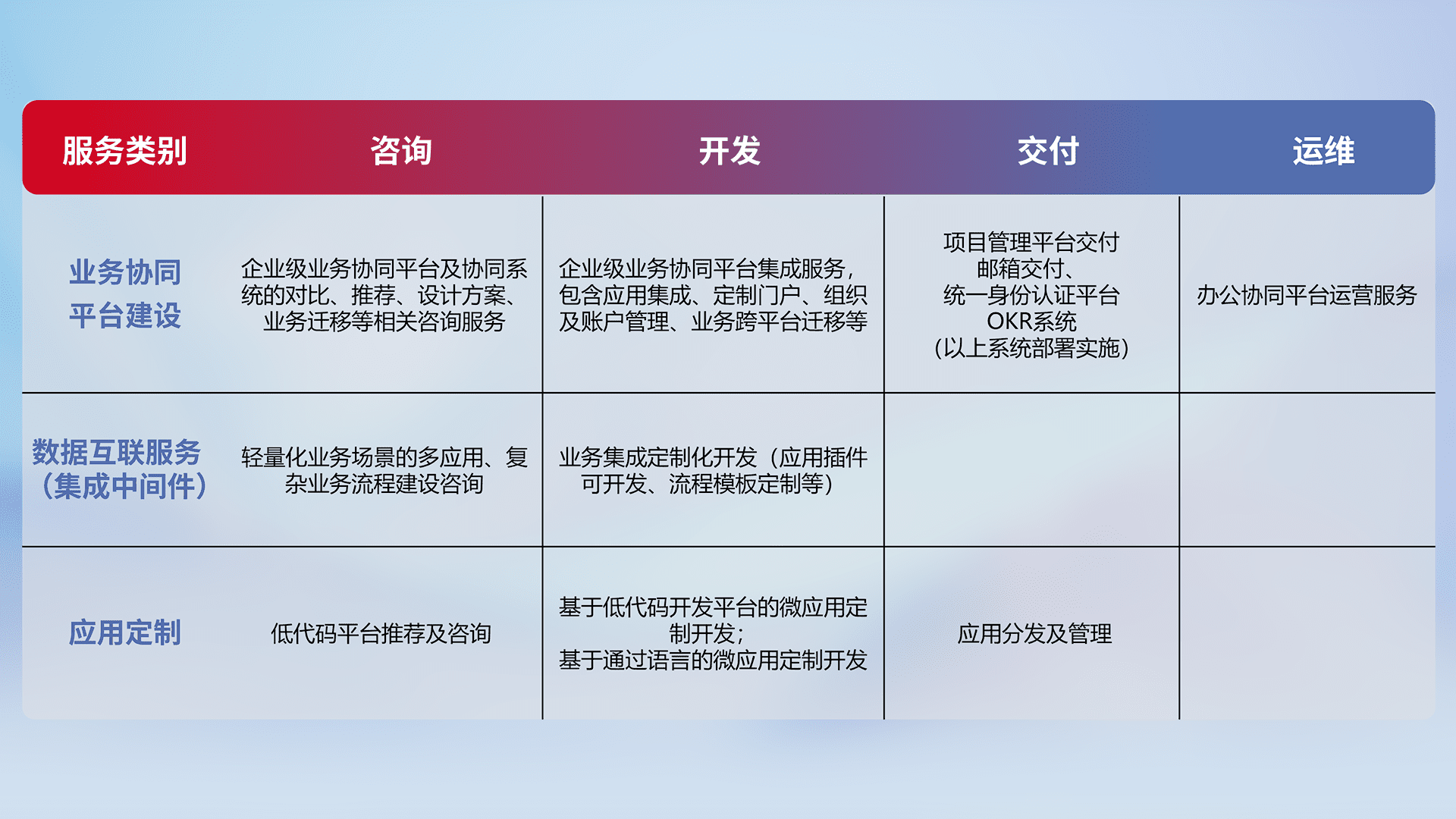 针对钉钉、、、、企微、、、、IDaas等平台级产品提供产品的规划、、方案、、交付、、、、定制化开发等服务,,,实现如统一协同办公、、智能客户服务、、、、混合会议管理、、、、智能数据查询、、等业务场景,,,,实现数字化转型。。