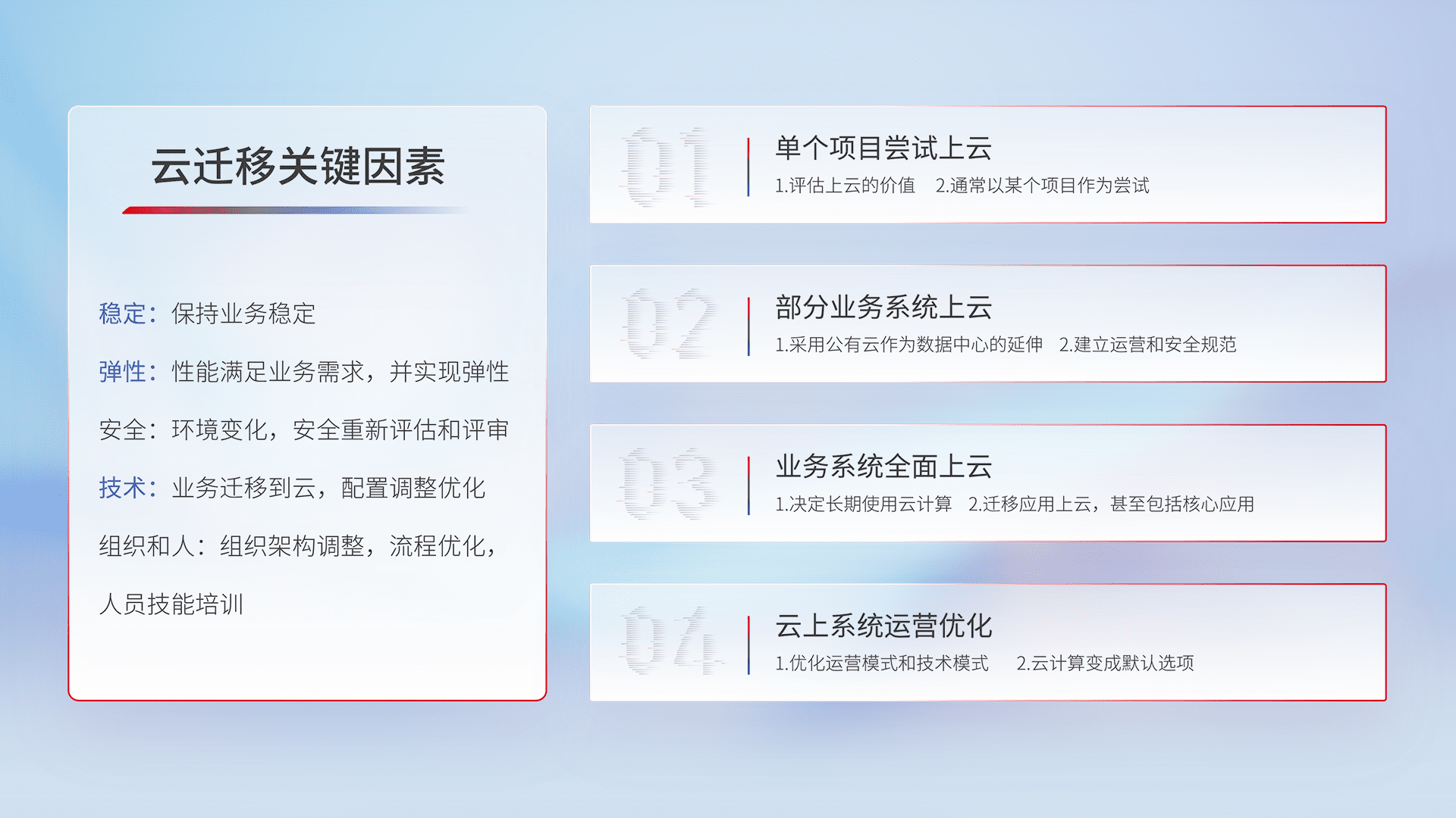 结合实际业务,,从规划设计、、、云平台选型、、、云原生改造、、、、数据迁移、、、、集成交付,,,迁移全过程为客户识别最佳上云路径,,做好风险识别管理,,设计网络架构、、、身份权限、、、、安全审计合规、、、、操作审计、、、、日志审计、、、、监控告警策略、、、多站点容灾设计等,,对云上基础设施进行整体规划,,提升IT治理水平,,,以满足弹性、、高可用、、、、高性能的需求。。。。