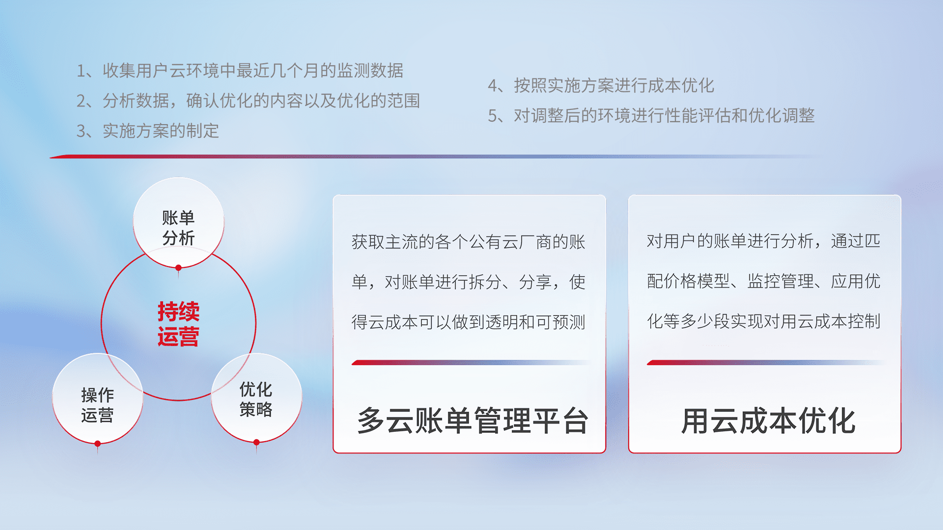 通过多云纳管,,,,以统一的资源数据模型把客户的云资源进行抽象和封装,,,,进而实现对多云资源的统一操作,,,保障云资源管理的可靠性、、稳定性与可用性。。。量身定制化运维内容,,配置、、、、开发运维、、、补丁管理、、备份、、监控、、、、认证和访问管理、、、审计和日常巡检等,,,保障在用云过程中的可靠度,,,稳定度以及高可用率。。
