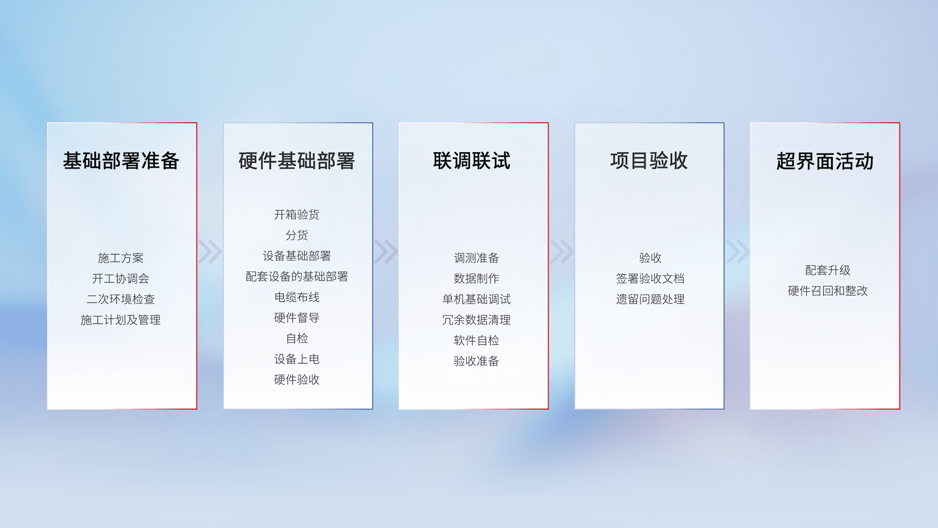 从基础部署准备、、硬件基础部署、、、、联调联试、、、项目验收、、、越界面活动的全过程可追溯,,,保证施工质量和进度。。。